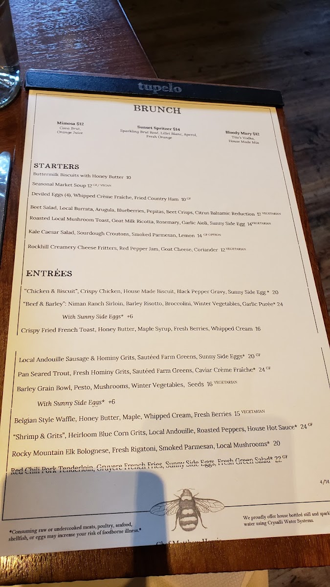 The menu at Tupelo showcases a delightful array of dishes that draw inspiration from seasonal ingredients and regional specialties. Brunch enthusiasts will be particularly impressed by the range of creative cocktails, such as the Mimosa, featuring Cava brut and fresh orange juice, or the Sunset Spritzer, a refreshing blend of sparkling rosé and Lillet Blanc, priced at just $12. Their celebrated fried chicken is a standout dish, described by local patrons as the best they've ever tasted. Pair this with comforting sides like the biscuits with honey, and indulge in sweet treats like the peaches and sorbet for a well-rounded dining experience.